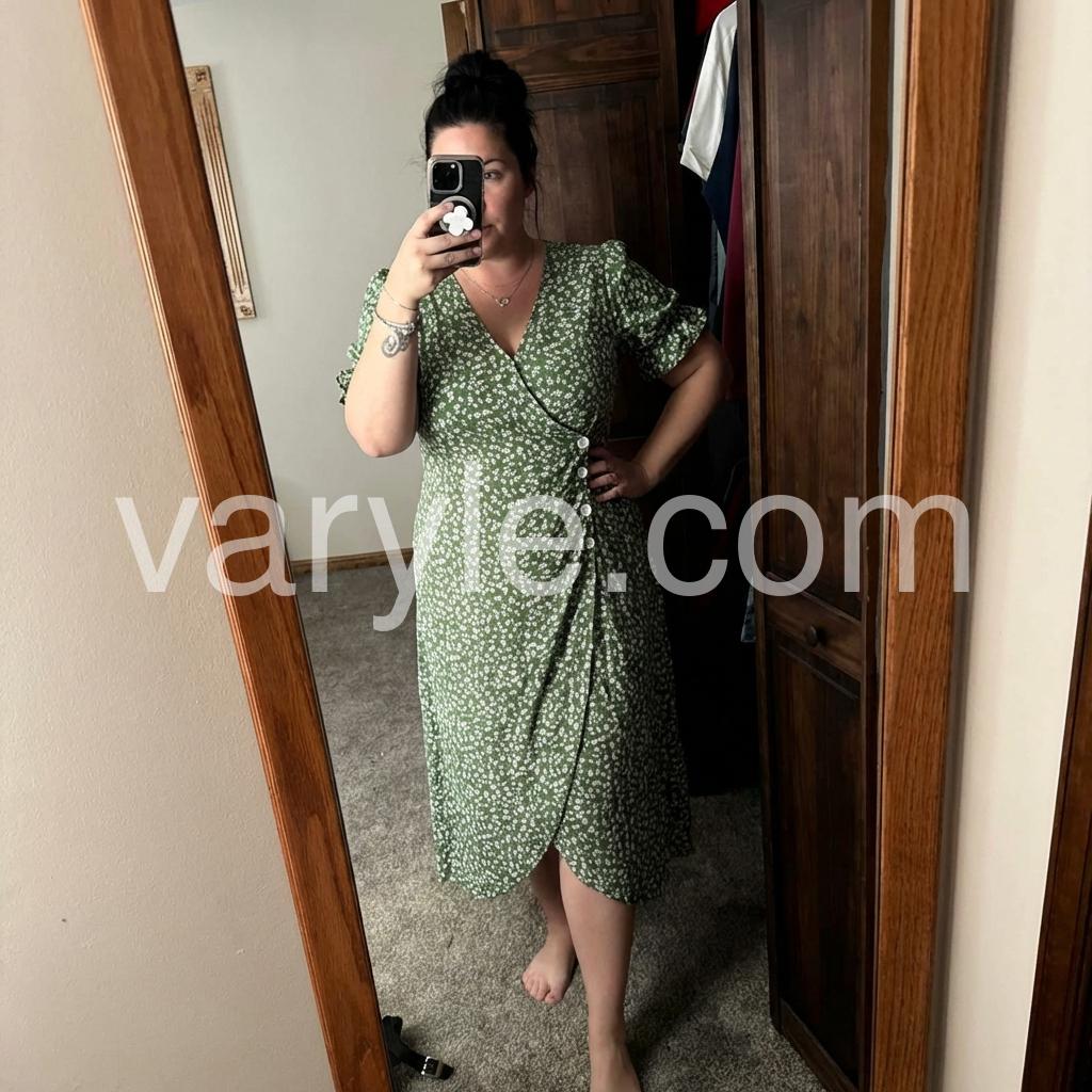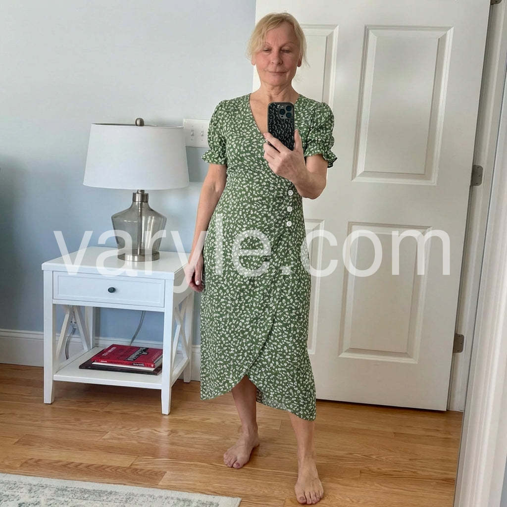 Get ready for summer with this sage green midi dress. Short sleeves with pleats on the front and buttons give it a cinched bodice and detail. The v-neck complements your favorite layering necklaces, accentuated by the mid-calf silhouette with an uneven hem. Finish your look with sandals, heels, or wedges.