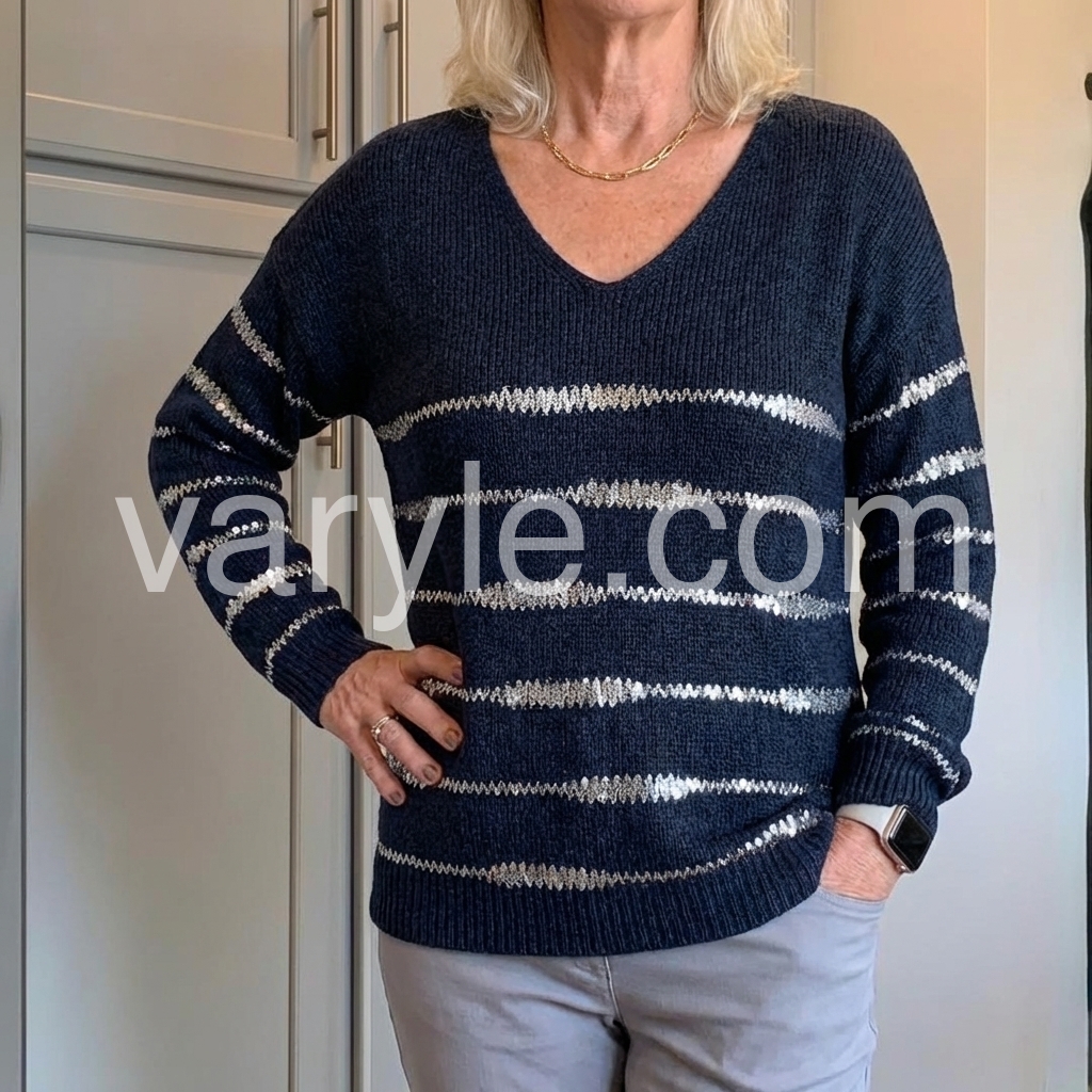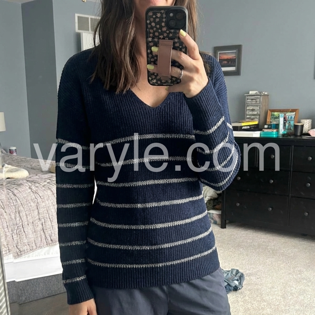 Yes!It runs true to the garment size chart please choose your size based on your measurements.Stay stylish and warm with our Groovy V-Neck Striped Print Navy Sweater. The v-neck adds a touch of elegance while the striped print adds a trendy flair. Made with high-quality materials, this sweater is perfect for any occasion. Upgrade your wardrobe and stay cozy this season.