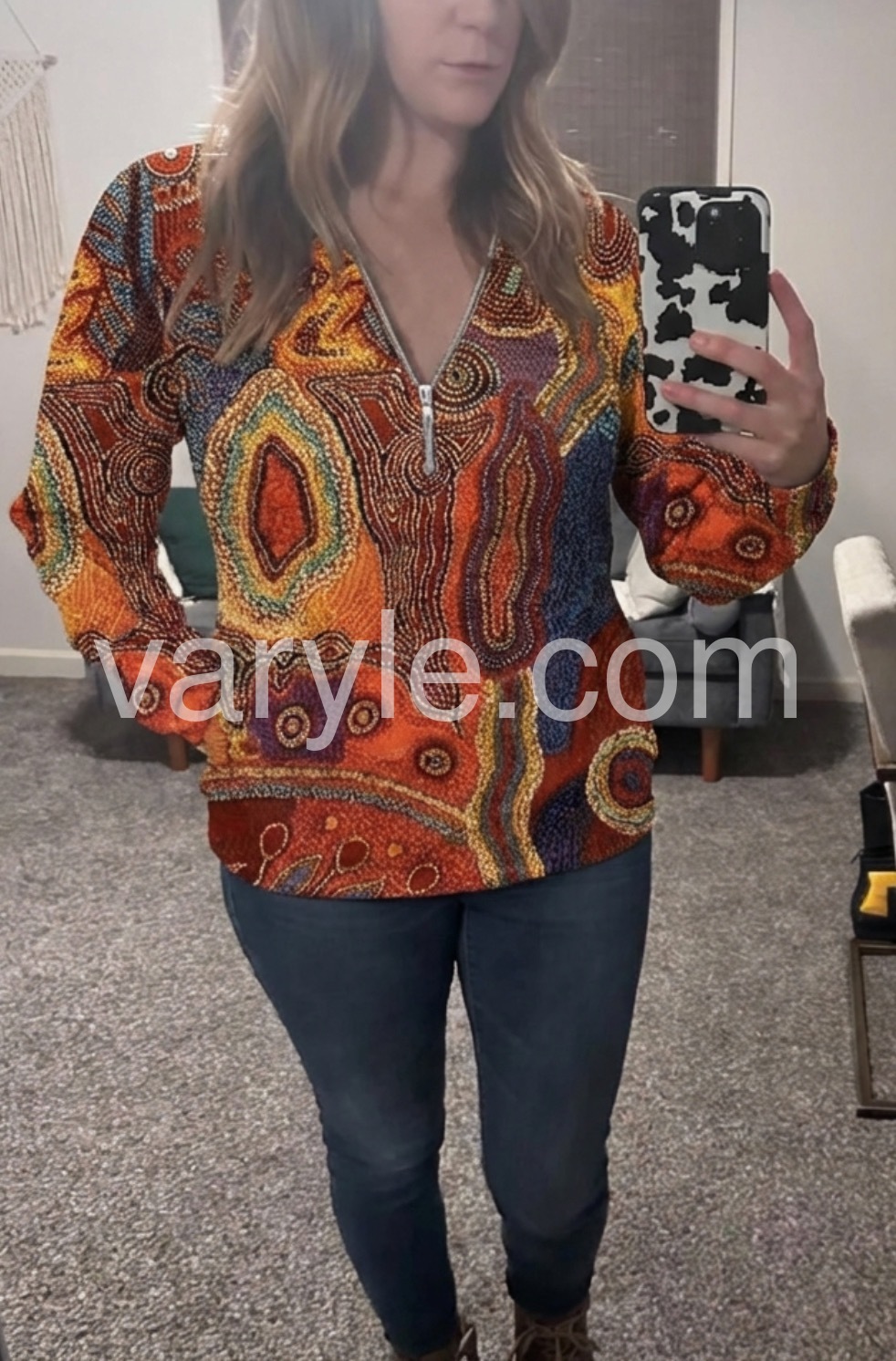 Autumn Aztec Geometric Zippered Long Sleeve Top